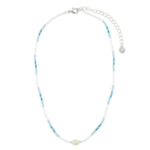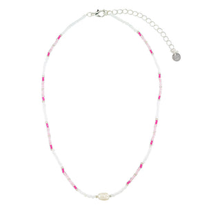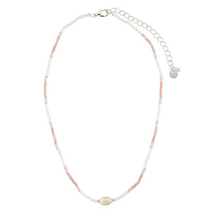 We love this Station Seedbead & Freshwater Pearl Necklace. The freshwater pearl adds a touch of elegance, while the bright seedbeads bring a fun twist. Perfect for any occasion!
